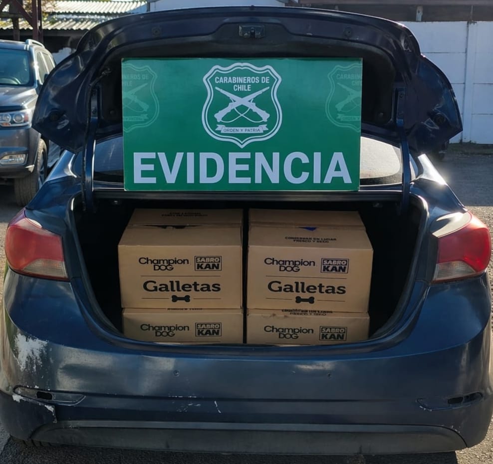 Al interior del vehículo en que se desplazaban se encontró parte de las especies sustraídas, correspondientes a 48 cajas de alimento para perro tipo galleta, avaluadas por la víctima en aproximadamente $2.500.000 pesos.